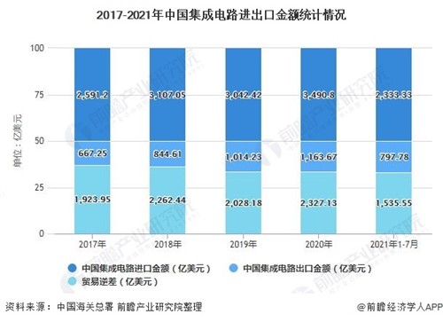 截止至2021年7月,我国集成电路行业进口金额达到2333.33亿美元,出口金额达到797.78亿美元,贸易逆差实现1535.55亿美元。