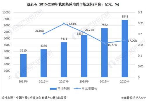 根据中国半导体行业协会数据显示,2015-2020年我国集成电路市场规模呈逐年增加趋势。2020年我国集成电路市场规模为8848亿元,较2019年增加17.00%。